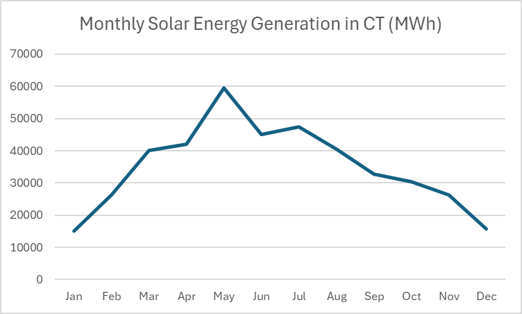 For instance, solar can only hit its name plate capacity (the maximum amount it can generate) during the summer months. In 2023, Connecticut generated three times as much solar energy in July as it did in December. The chart below highlights the cyclical rise and fall of solar generation.