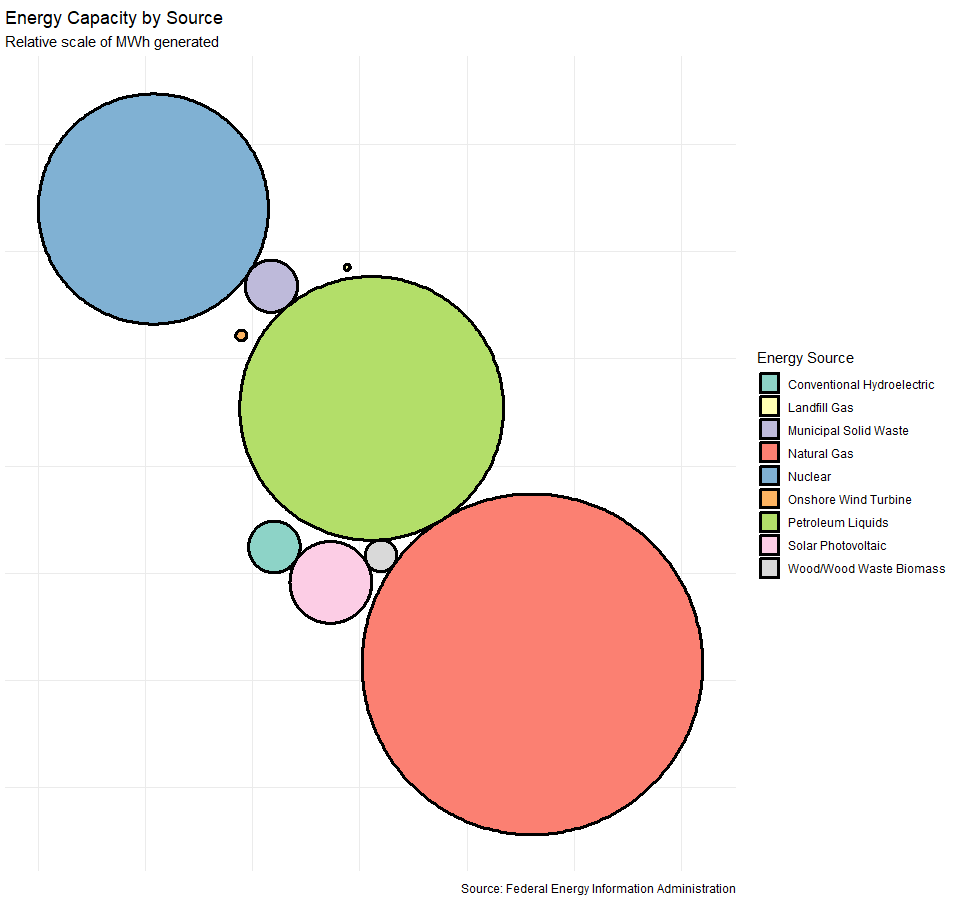 To answer this question, a good place to start is the capacity of the state’s generators. The visualization below makes it easier to understand what the energy generation eco-system looks like in CT. As you can see from this chart, natural gas, petroleum liquids (e.g. oil), and nuclear are the three core generating sources in CT. Solar and hydro are a distant fourth and fifth.